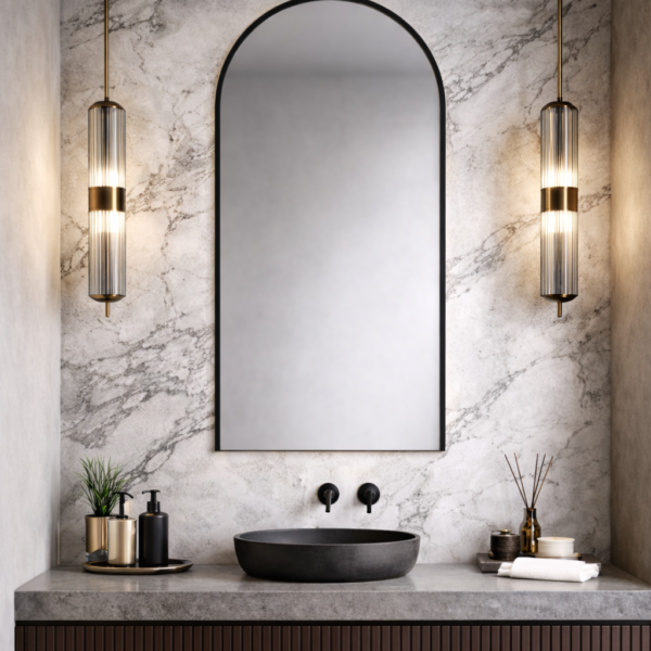 Jednocześnie stabilna dolna krawędź pozwala uzyskać spójną kompozycję z meblami, a zaokrąglona góra łagodzi geometrię wnętrza.